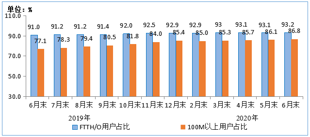 图3 2019年-2020年6月末光纤接入(FTTH/O)和100Mbps及以上接入速率的固定互联网宽带接入用户占比情况