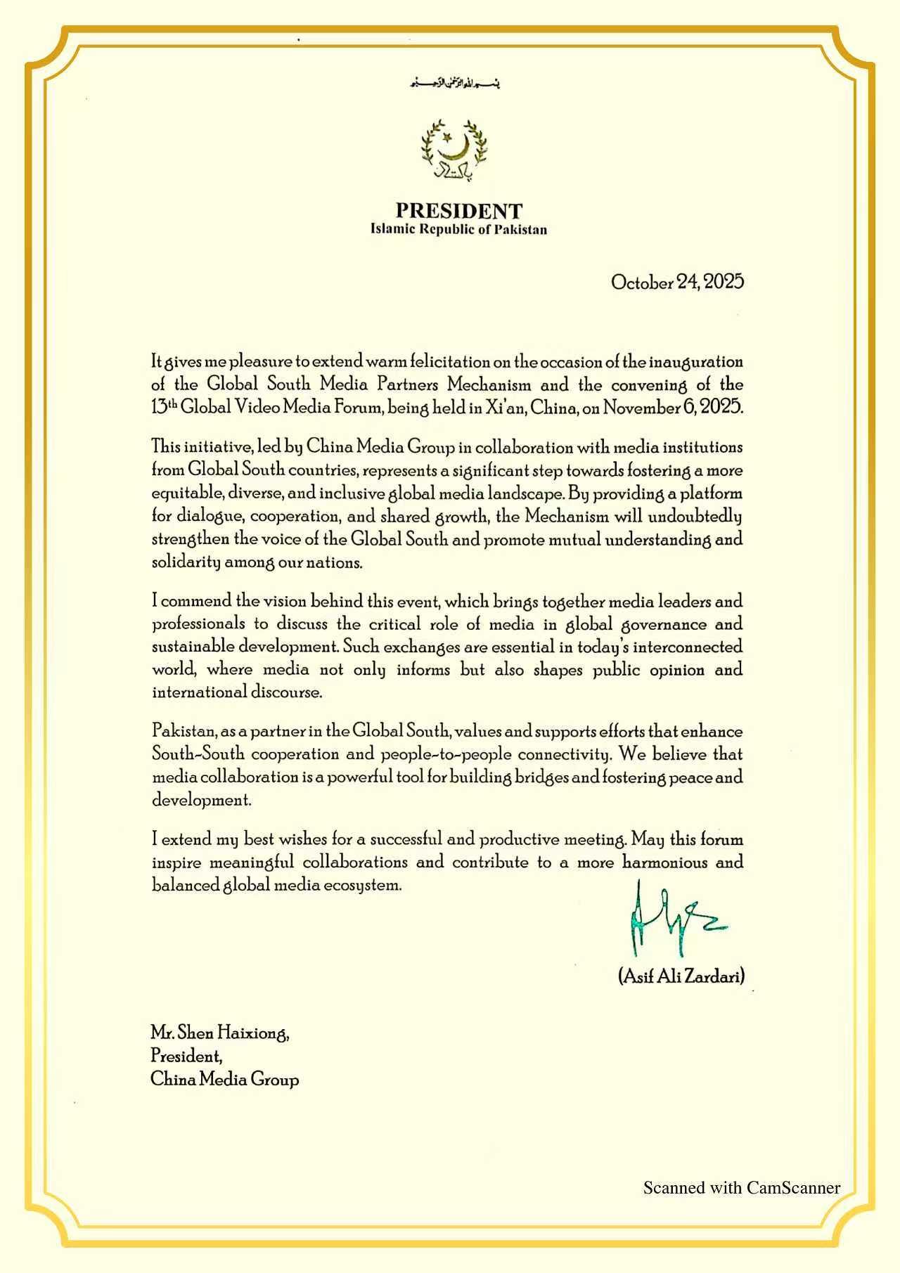 扎尔达里在贺信中指出,中国中央广播电视总台发起成立“全球南方媒体伙伴”机制,是朝着构建更加公平公正、多元包容的全球传播新格局迈出的重要一步。作为“全球南方”的一员,巴基斯坦始终高度重视并积极支持深化南南合作、促进人文交流。媒体合作是搭建沟通桥梁、促进和平与发展的重要手段。祝愿大会取得丰硕成果,为构建更加和谐、均衡的全球媒体生态贡献力量。